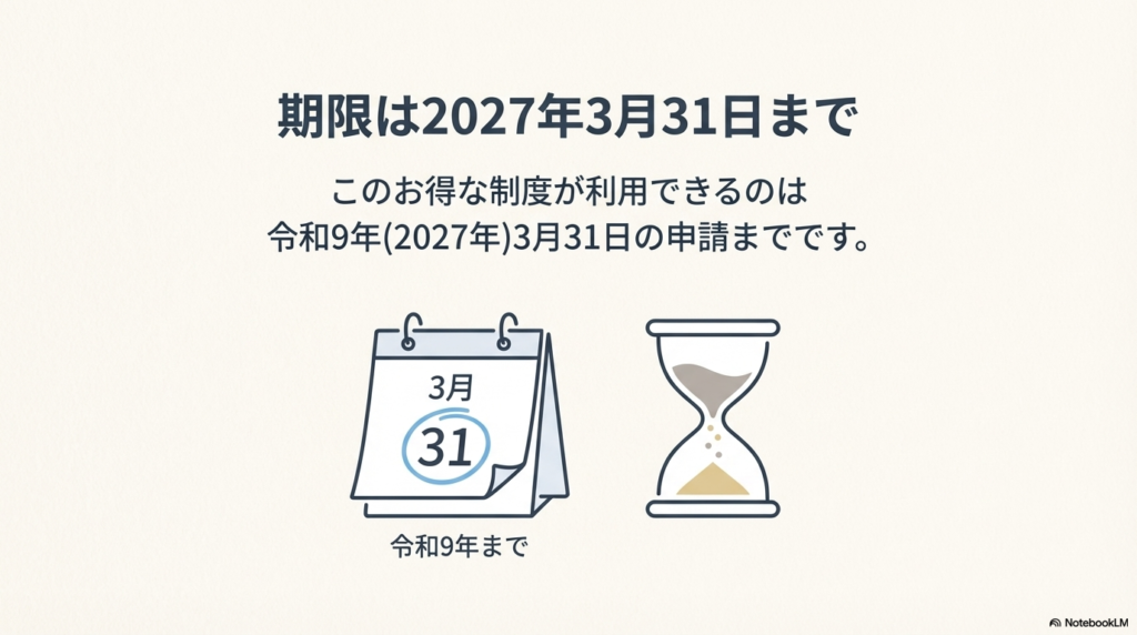 ここからが本題です。現在、特定の条件を満たす相続登記について、この登録免許税がゼロになる特例(登録免許税の免税措置)が設けられています。この制度は令和9年(2027年)3月31日までの期間限定です。