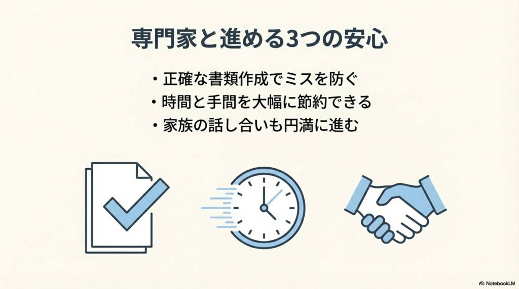 • 時間と手間の節約 平日に役所や法務局へ何度も足を運ぶ手間が省け、時間的・精神的な負担を大幅に軽減できます。