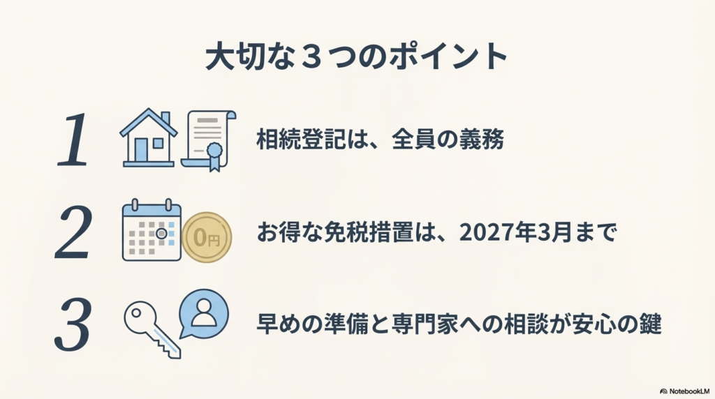 • ポイント3:期限は令和9年3月31日まで この特例措置は、令和9年(2027年)3月31日までの申請が対象です。相続手続きには戸籍の収集などで時間がかかることもありますので、早めに準備を始めることが大切です。