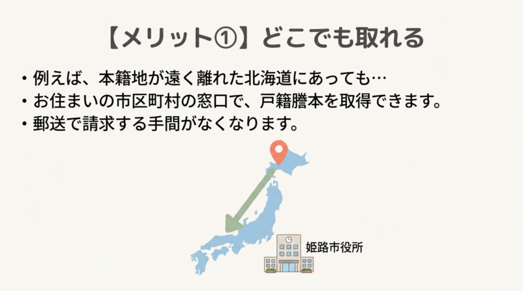 これまで戸籍証明書は、その人の本籍地がある市区町村の役所でしか取得できませんでした。しかし、この制度によって、本籍地がどこであっても、全国どこの市区町村の窓口でも戸籍証明書を請求できるようになりました。
