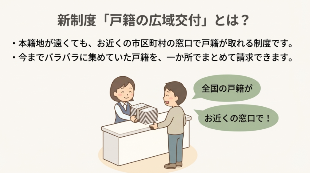 戸籍の広域交付制度とは、令和6年3月1日に開始された、全国の戸籍情報を連携させる「戸籍情報連携システム」を活用した新しい仕組みです。