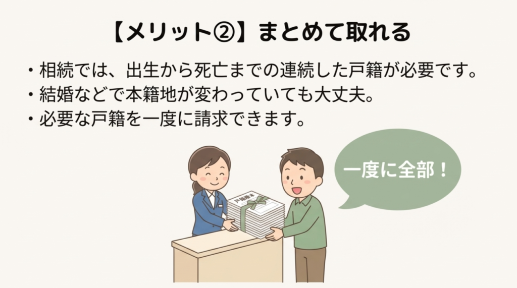 この制度は、特に相続手続における戸籍収集の場面で大きな影響を与えます。メリットを活かしつつ、注意点を理解しておくことが、スムーズな手続の鍵となります。