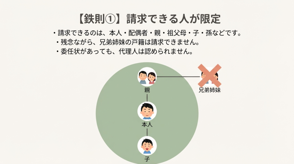 この制度を利用できるのは、戸籍に記載されている本人、その配偶者、直系尊属(父母・祖父母など)、そして直系卑属(子・孫など)です。兄弟姉妹の戸籍は取得できません。また、委任状を使った代理人による請求も一切認められていません。