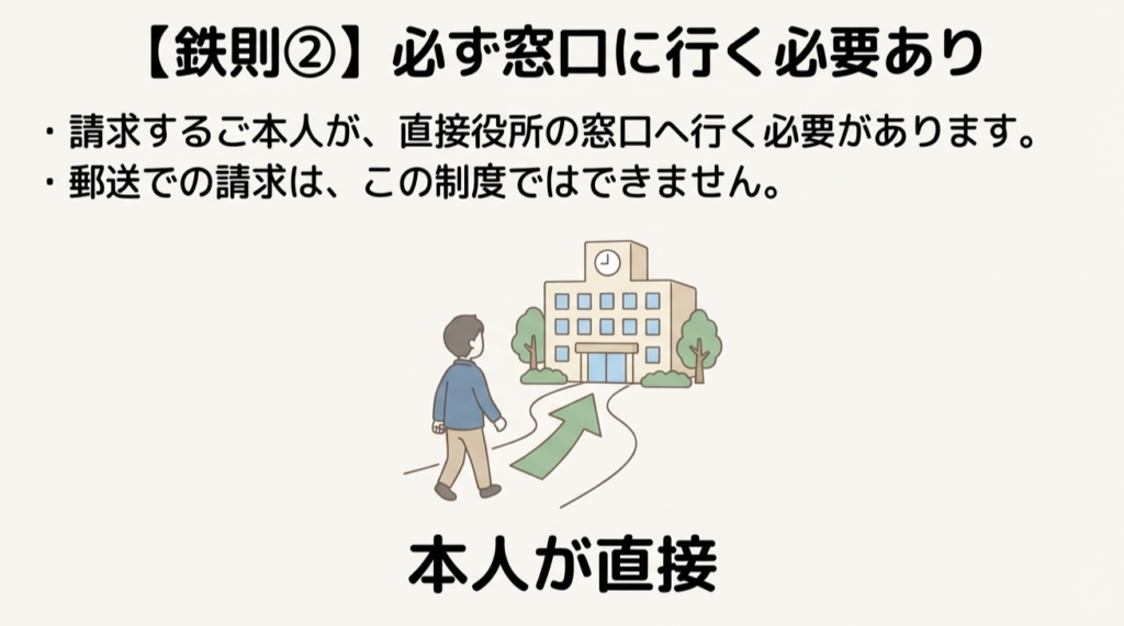 郵送での請求や、司法書士を含む専門家が代理で請求することはできません。請求資格のある方ご本人が、必ず市区町村の窓口に出向く必要があります。