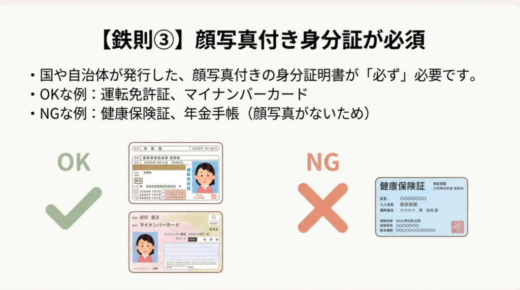 - 認められるもの: 運転免許証、マイナンバーカード、パスポートなど