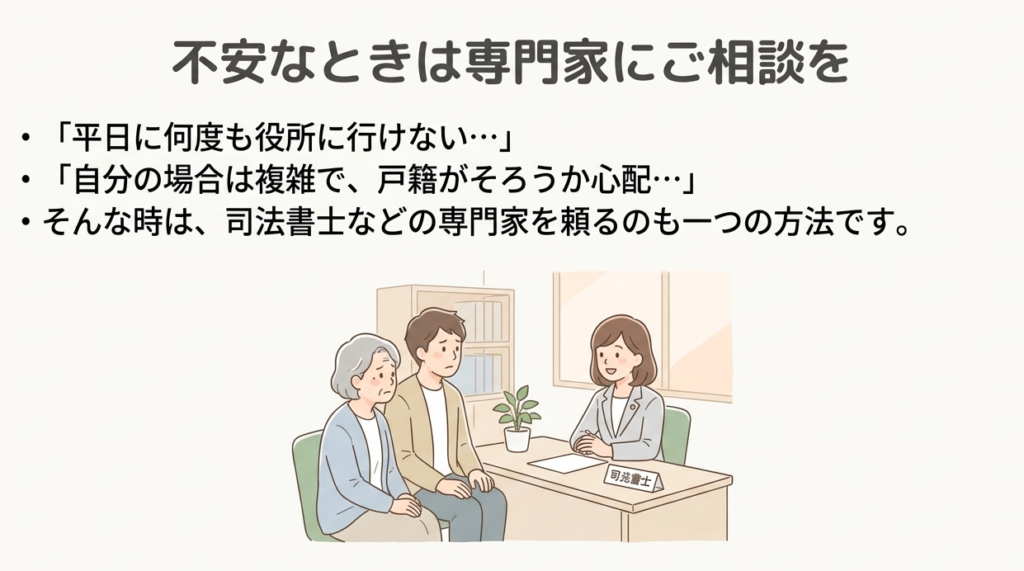 広域交付制度には、上記のような制約や注意点があります。「平日に何度も役所へ行く時間がない」「自分のケースは兄弟姉妹が相続人で複雑だ」「集めた戸籍に抜け漏れがないか不安」といった方も多いのではないでしょうか。