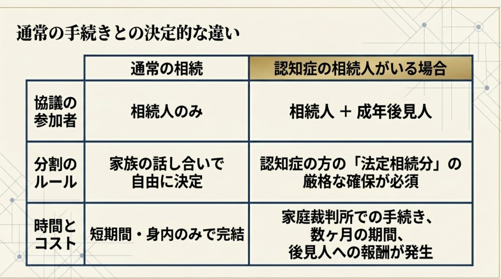 認知症の方がいる相続手続きは、家庭裁判所での手続きが必要となるため、通常の相続よりも時間と労力がかかり、法的な専門知識が不可欠です。