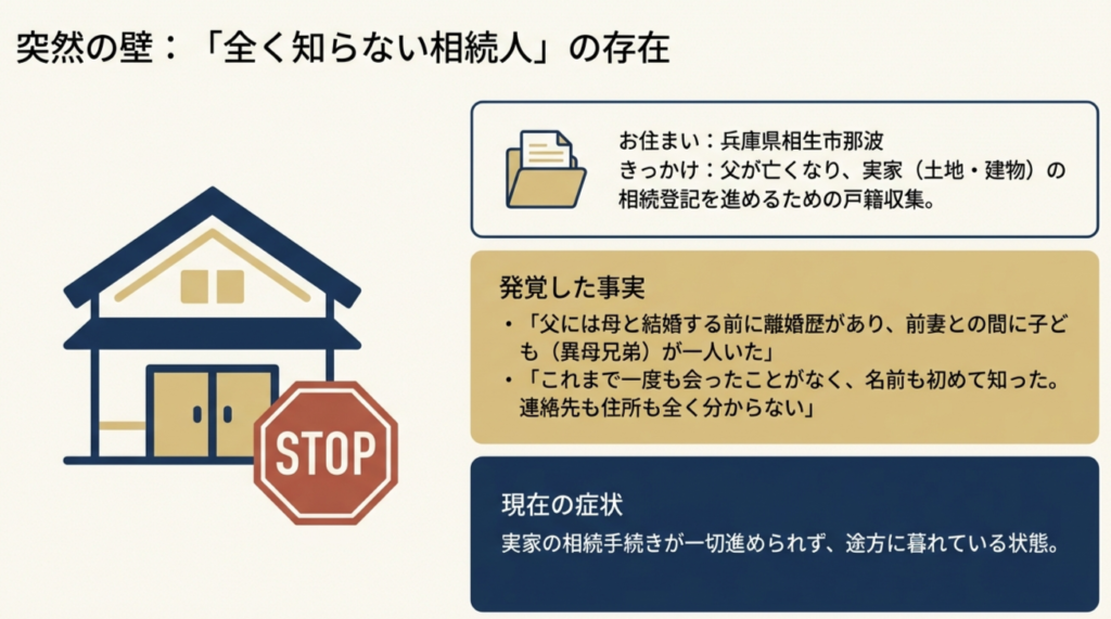 これまで一度も会ったことがなく、名前も戸籍で初めて知りました。現在どこに住んでいるのか、連絡先も全く分かりません。このままでは実家の相続手続きが進められないと聞き、途方に暮れています。