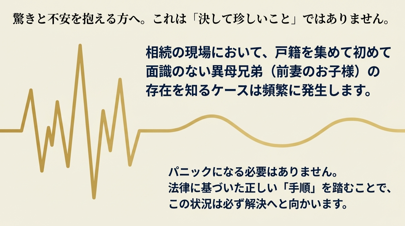 戸籍を集めて初めて、面識のない異母兄弟(前妻のお子様)の存在を知るというケースは、実は相続の現場では決して珍しいことではありません。驚きと不安でいっぱいかと存じますが、法的な手順を踏めば解決へ向かうことができます。