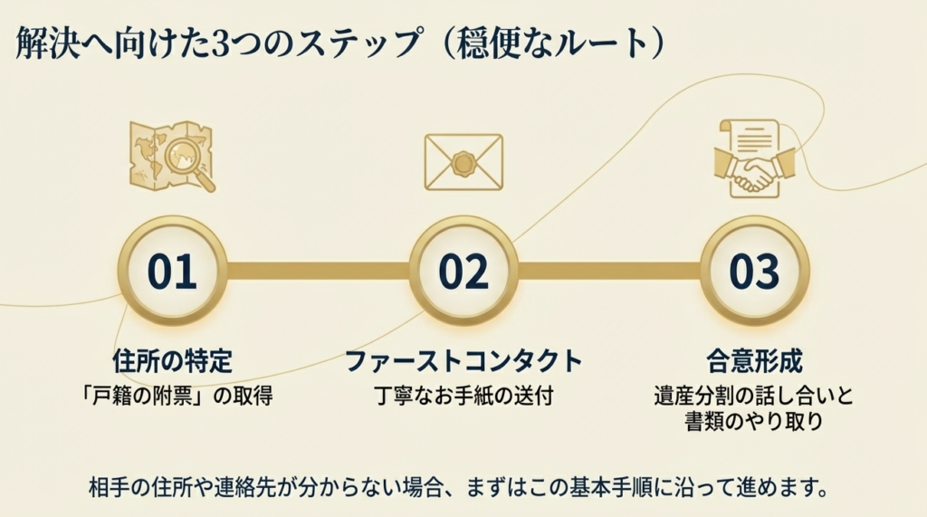 住所が判明しても、いきなりご自宅を訪問したり、突然電話をかけたりするのはトラブルの原因になりやすいためお勧めしません。まずは丁寧なお手紙(ご挨拶状)をお送りし、お父様が亡くなった事実と、相続手続きに協力していただきたい旨を誠実にお伝えします。 - 遺産分割の話し合い・書類のやり取り