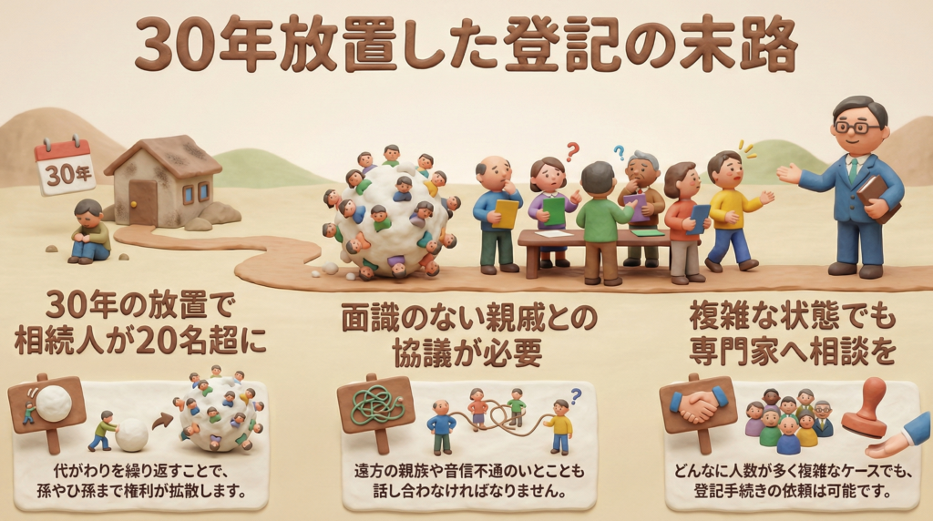 法改正により相続登記は義務化されました。これ以上の放置は、将来の世代(ご自身のお子様など)に重い負担を残すことになります。