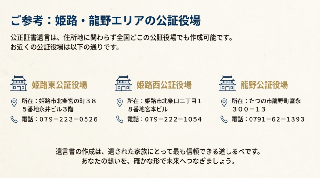 兵庫県西部の姫路市とたつの市には、それぞれ公証役場が設置されています。遺言書の作成、任意後見契約、離婚協議書の公正証書化、定款認証など、法的な手続きを行う際には、公証役場の利用が必要となる場合があります。