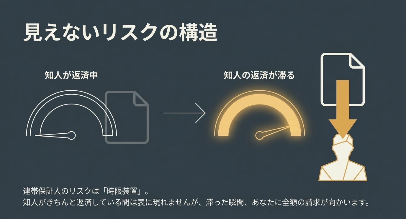 もし、お金を借りた本人(主債務者)が返済できなくなった場合、金融機関等からご相談者様に対して、残りの借金を一括で返済するよう請求が来るリスクを背負うことになります。