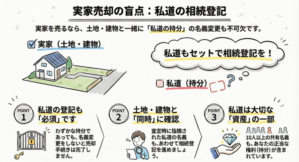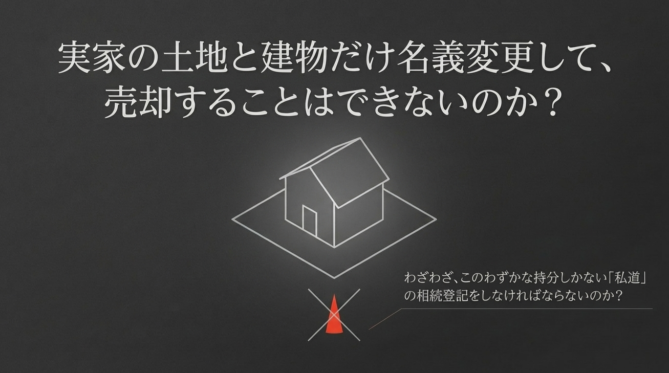 結論から申し上げますと、私道の持分(共有名義となっている権利)についても、必ず相続登記(名義変更)をする必要があります。実家の土地・建物だけを相続登記して売却することは、事実上できません。